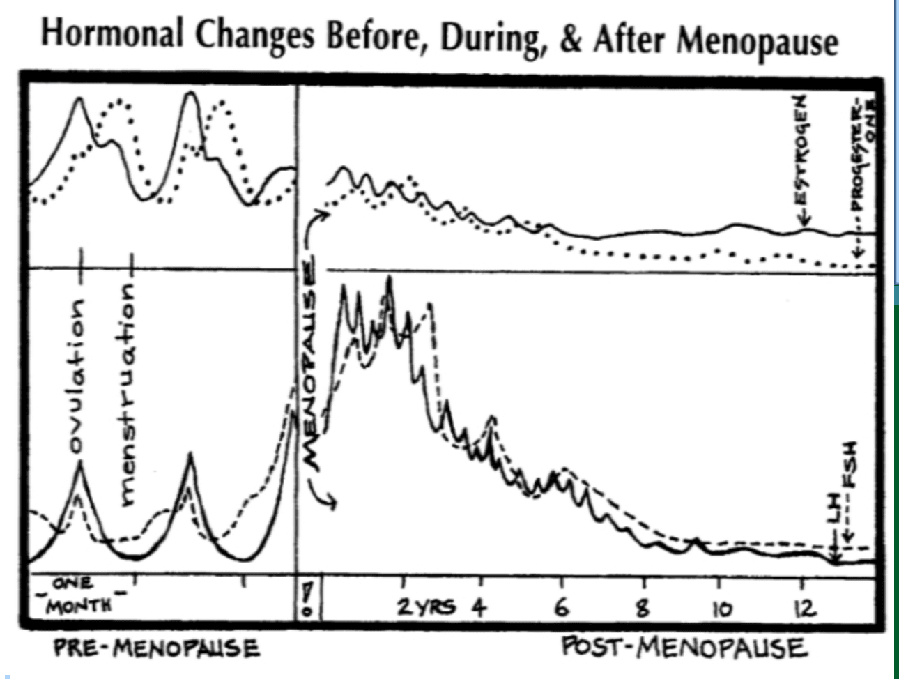Below is a chart taken from Susun Weeds excellent book 'New menopausal Years: The Wise Woman way'. FSH is Follicle Stimulating Hormone and LH is Luteinizing Hormone. As you can see, all hormone levels are erratic during pre/peri-menopause and don't settle until well after the last period, when menopause is achieved.