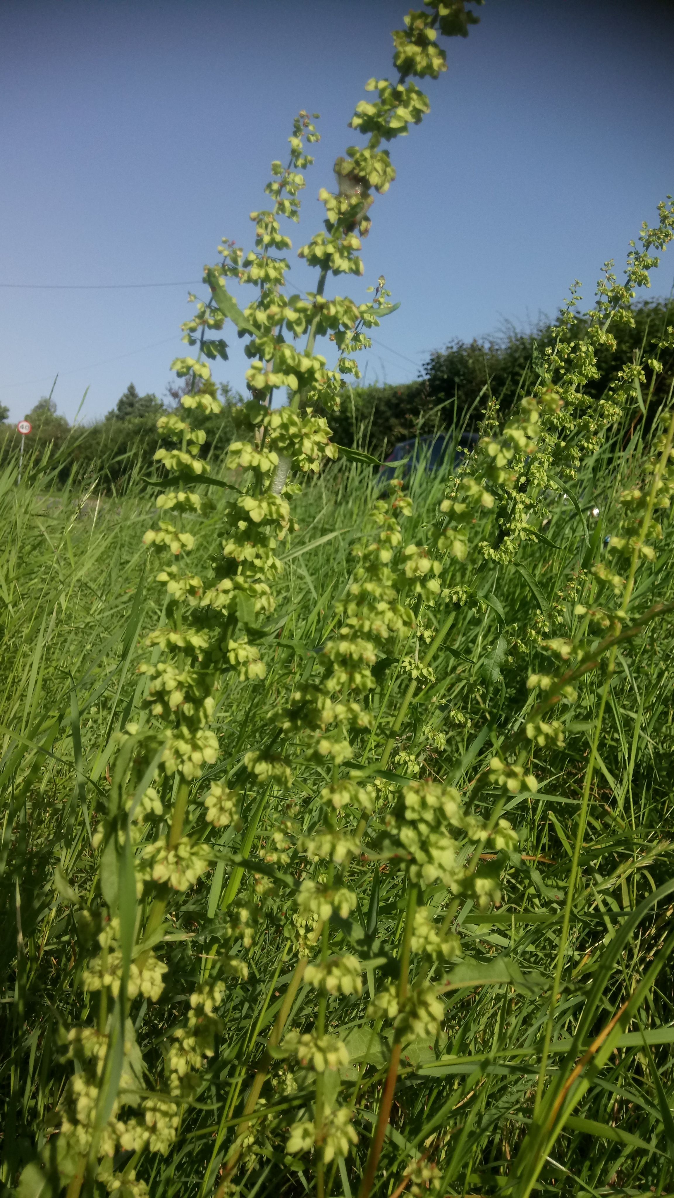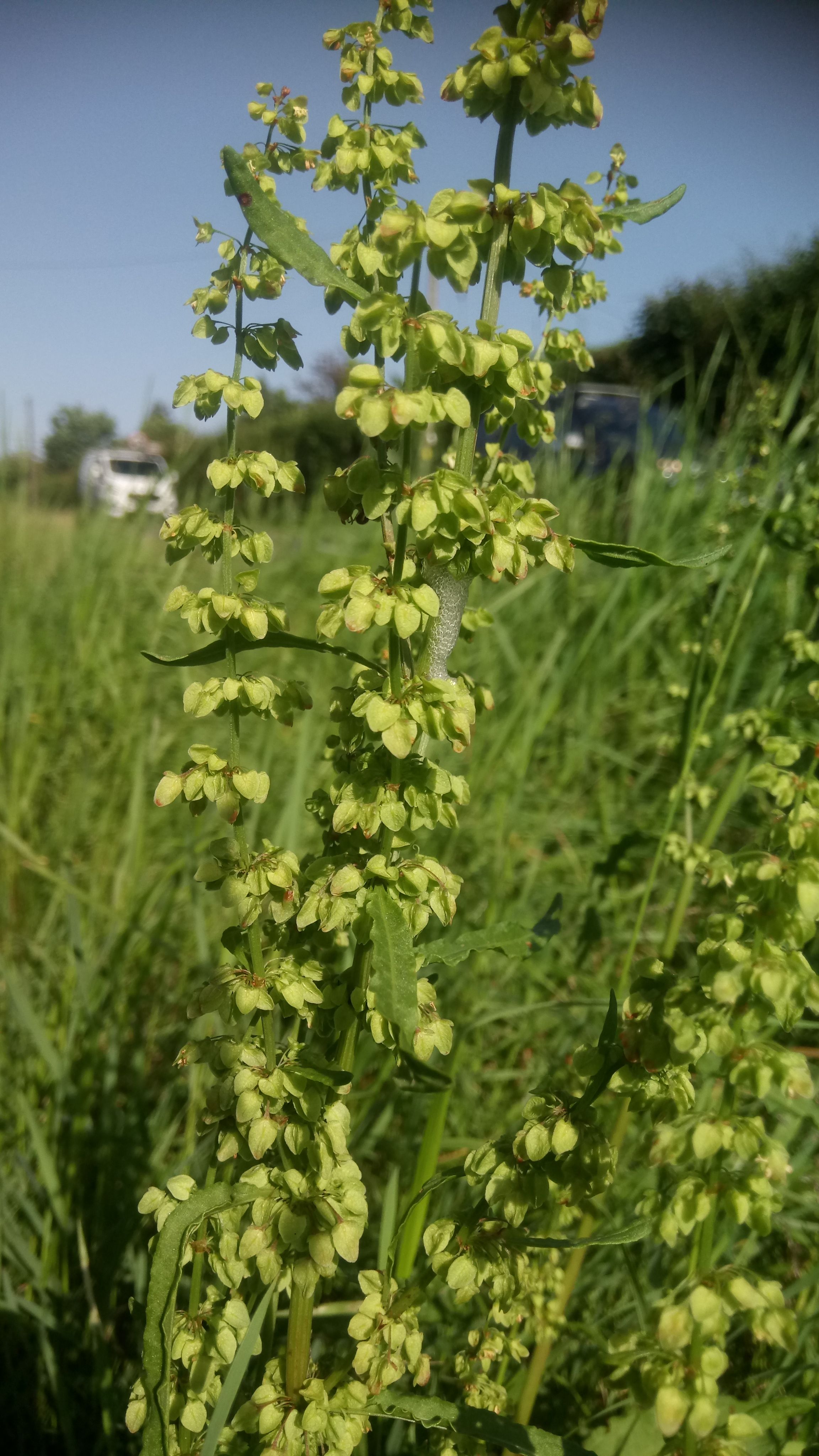 The leaves arise from a basal rosette with a tall stiff, ribbed flowering stalk reaching up to 1. 5 metres high. Leaves are long and thin with distinct curly leaf edges. The more common broad leaved dock has much wider leaves with no curled edges. The flowers are produced along the length of the stalk in small clusters on branching stems and are yellowish green in colour, turning to rusty red in late summer/autumn. Old flower stalks often survive above ground over winter and provide a useful marker for spring foraging.